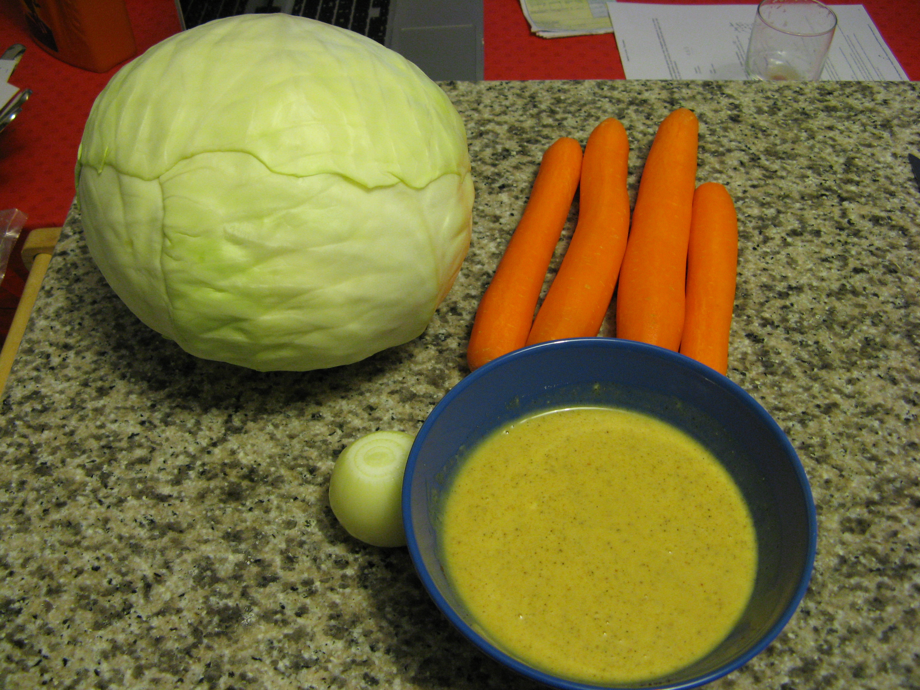 3) Emincer le chou (généralement une moitié suffit) en fines lanières.