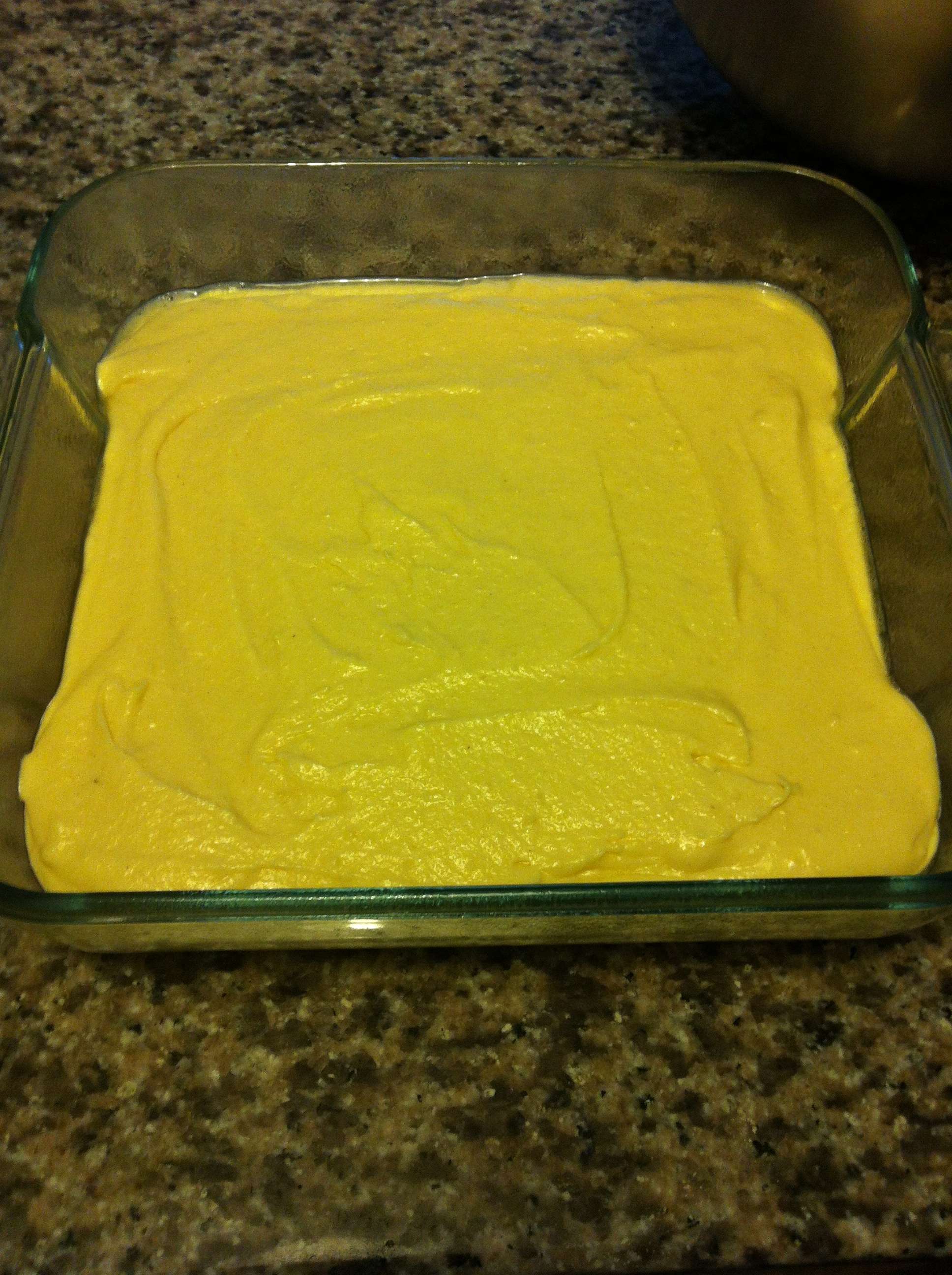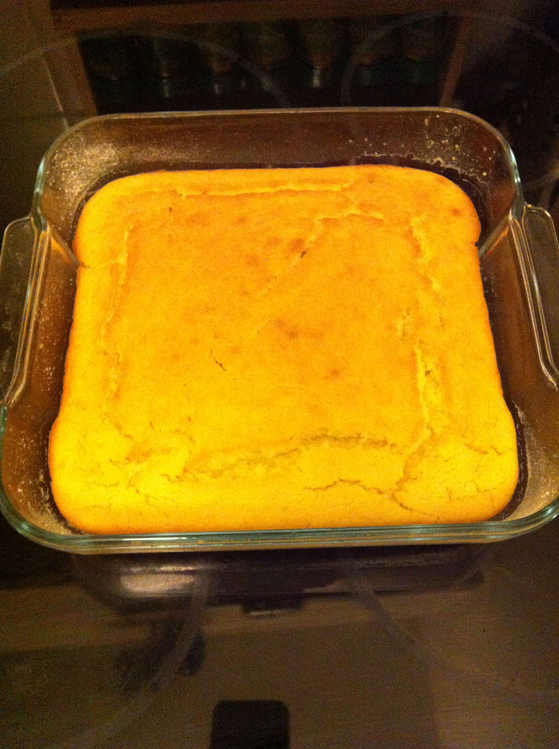 6) Verser dans votre plat et enfourner pendant environ 30 minutes. La cuisson est terminée lorsque le dessus de votre pain de maïs est doré.