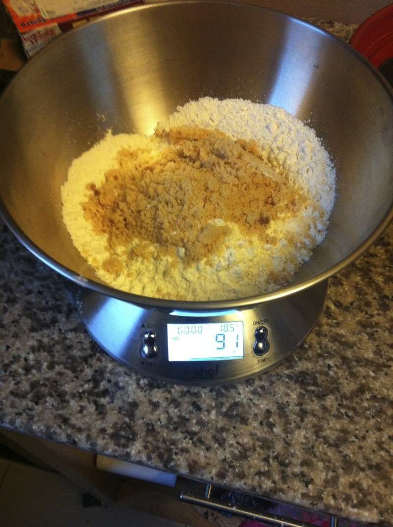 6) Ajouter ensuite 1/3 du mélange sec à la consistance type « crumble ».