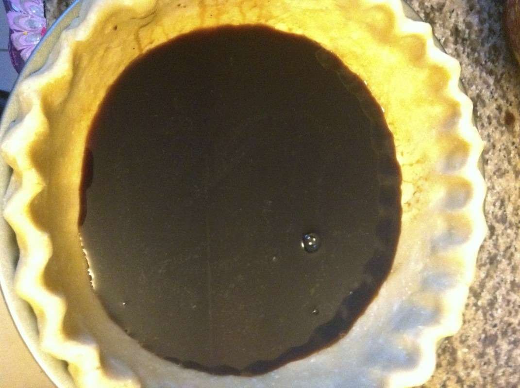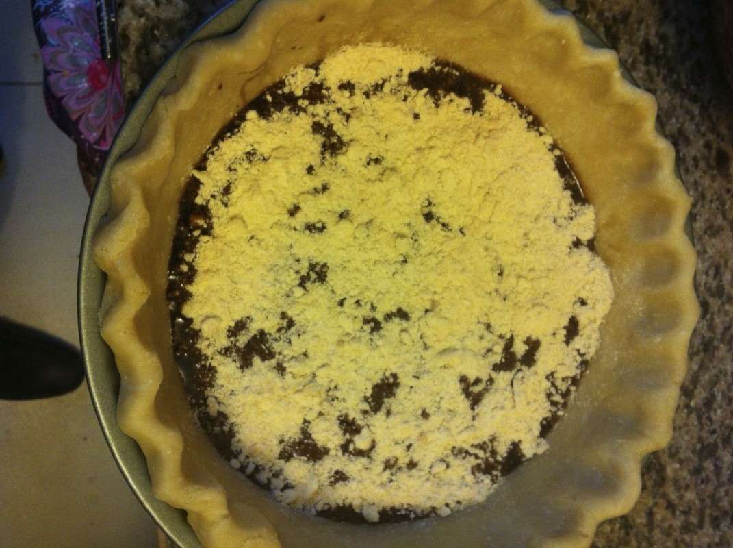 5) Verser 1/3 du mélange liquide sur la pâte (non cuite au préalable).