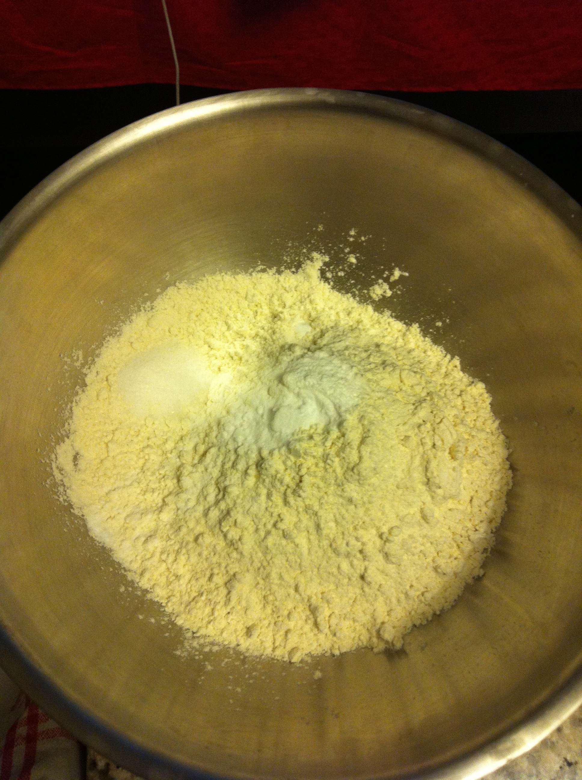 3) Dans un grand bol, mélanger au fouet l’ensemble des ingrédients secs : farine, levure chimique et sel.