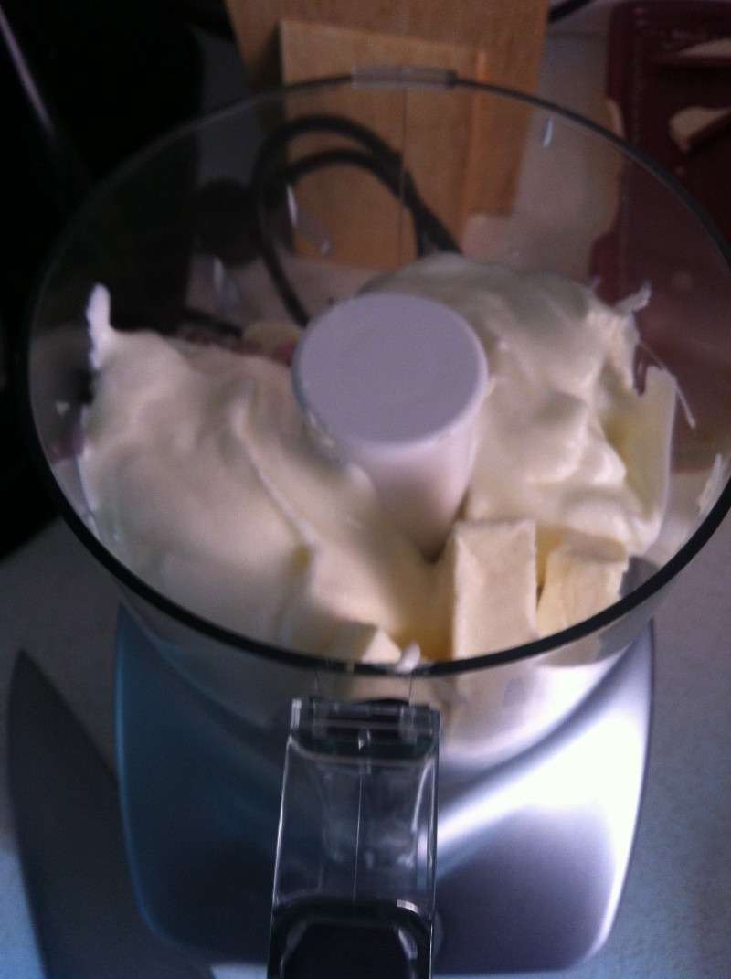 2) Dans un petit robot comme Le micro Magimix, mettre les 4 portions de vache qui rit, les 3 ou 4 cuillères de crème et les échalotes.