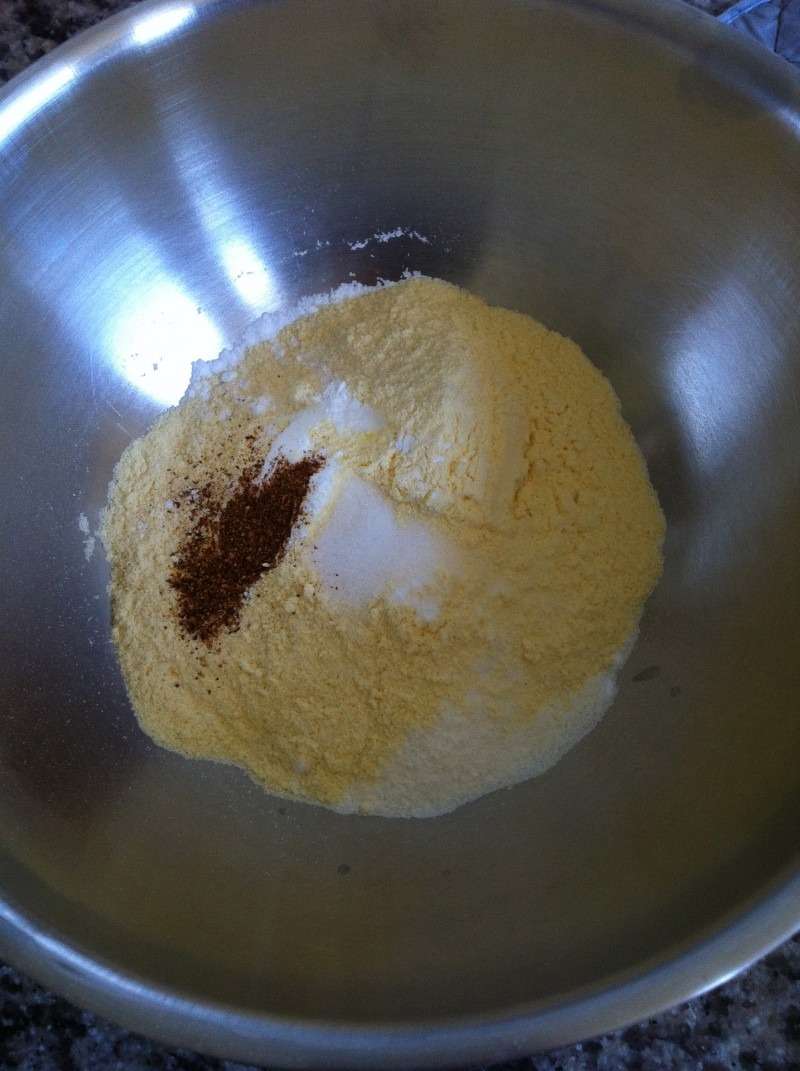 3) Pendant ce temps, mélanger dans un grand bol les farines, les levures et le piment de cayenne.