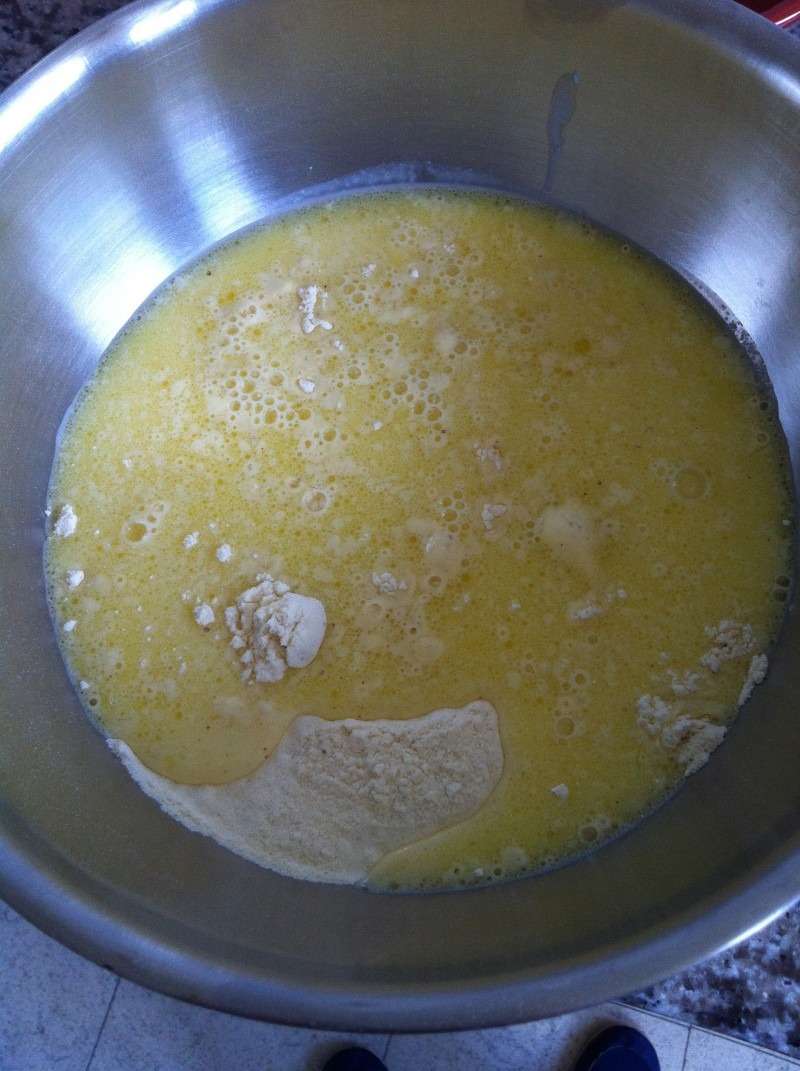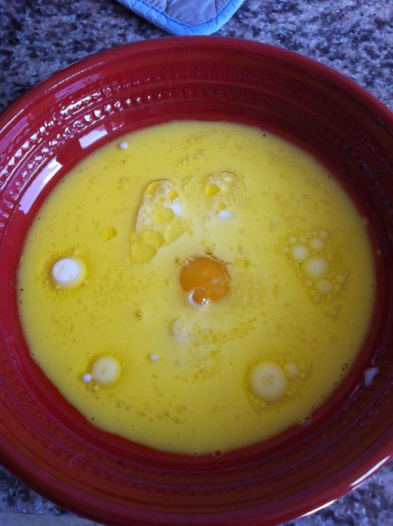 4) Faire un mélange liquide : mélanger l’oeuf, le lait et l’huile. Verser sur le mélange sec jusqu’à l’obtention d’une pâte homogène.