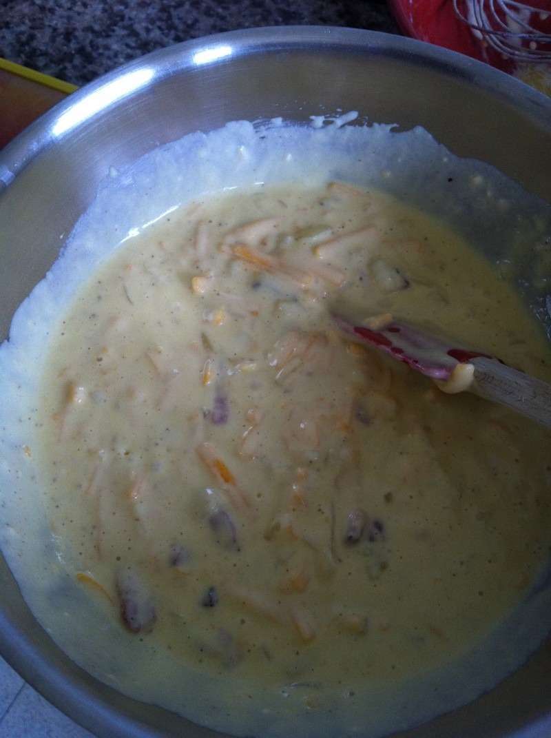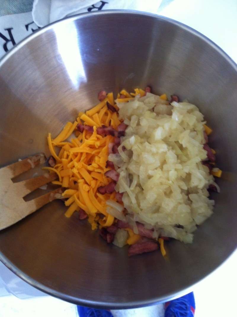 5) Lorsque les lardons et les oignons ont refroidi, les ajouter dans la pâte à cupcakes.