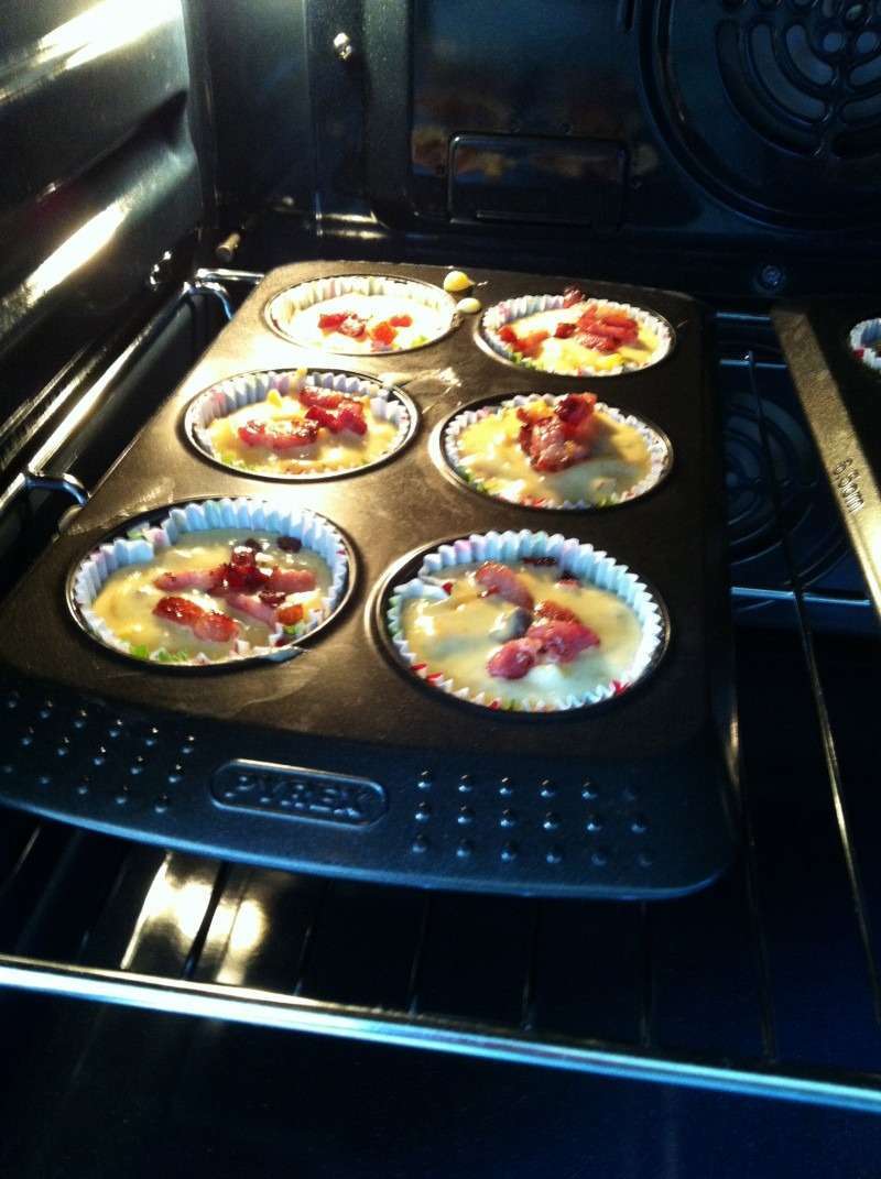 6) Disposer alors quelques morceaux de bacon sur le dessus des cupcakes.