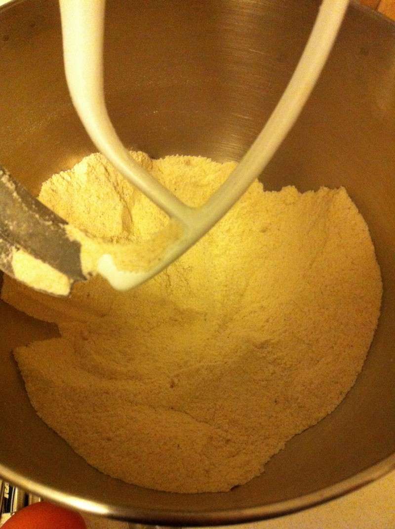 6) Dans un cul de poule en inox, mélanger l’ensemble des ingrédients secs.