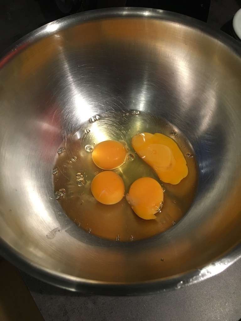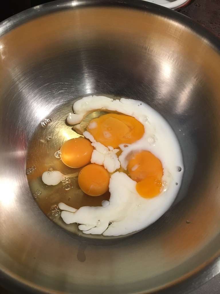 3. Dans un grand cul-de-poule, casser les oeufs et ajouter le lait. Mélanger et réserver.