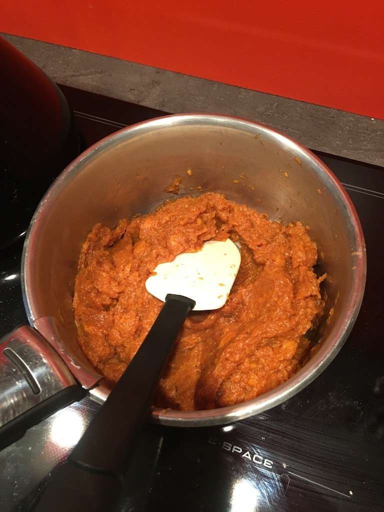 4. Dans une casserole de taille moyenne, verser la purée de citrouille (environ 400g). Ajouter les différentes épices : cannelle, muscade et clou de girofle. Cuire à feu moyen pendant 5 à 10 minutes, jusqu’à l’obtention d’une purée assez sèche.