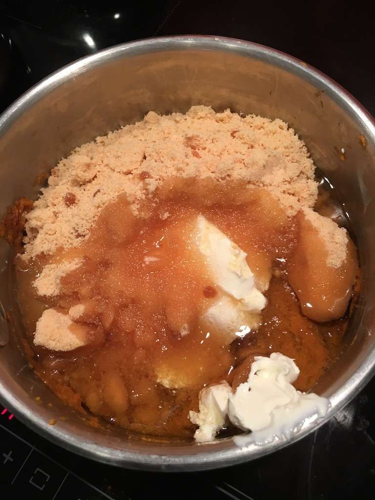 5. Après l’avoir retirée du feu, ajouter la cream cheese coupée préalablement en morceaux et faire fondre en mélangeant au fouet. Ajouter le sucre, la cassonade et l’huile. Mélanger jusqu’à ce que le mélange soit homogène. Laisser refroidir 5 minutes.