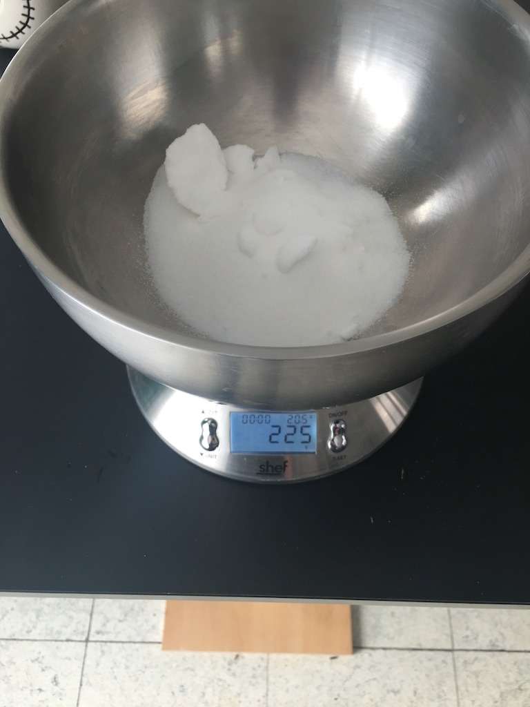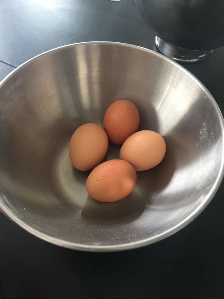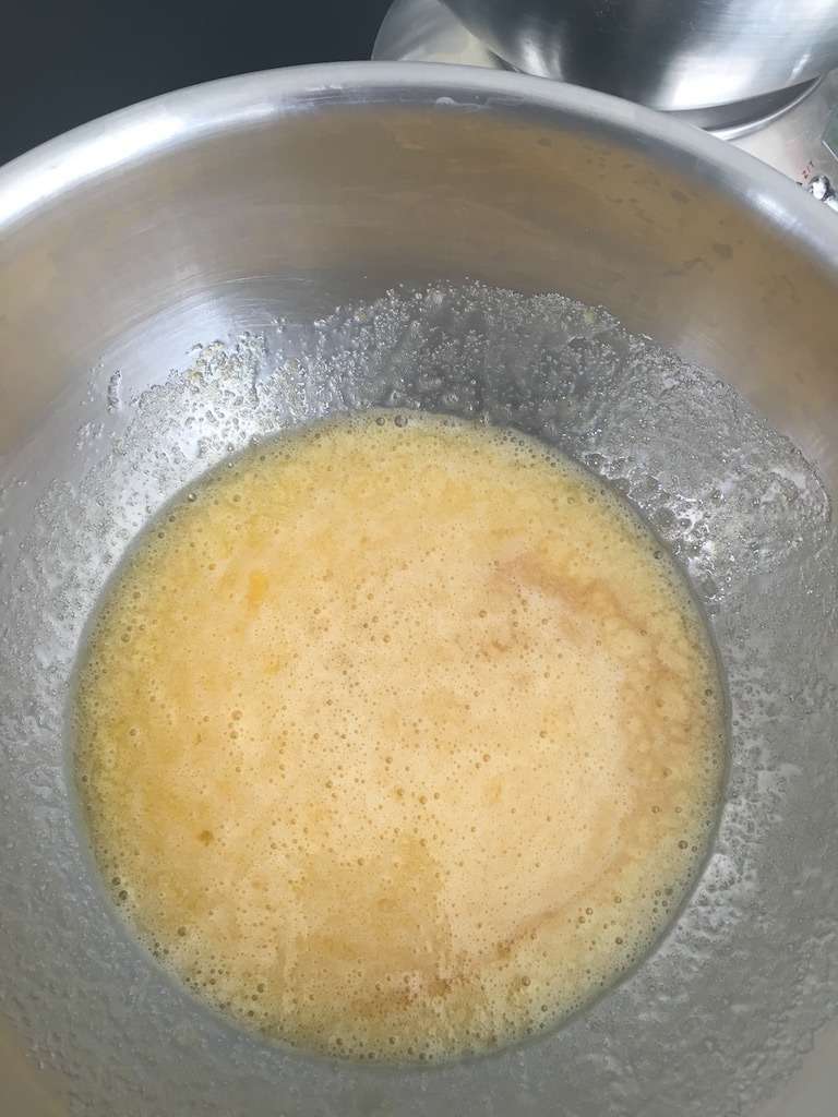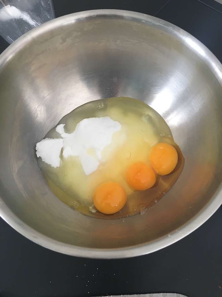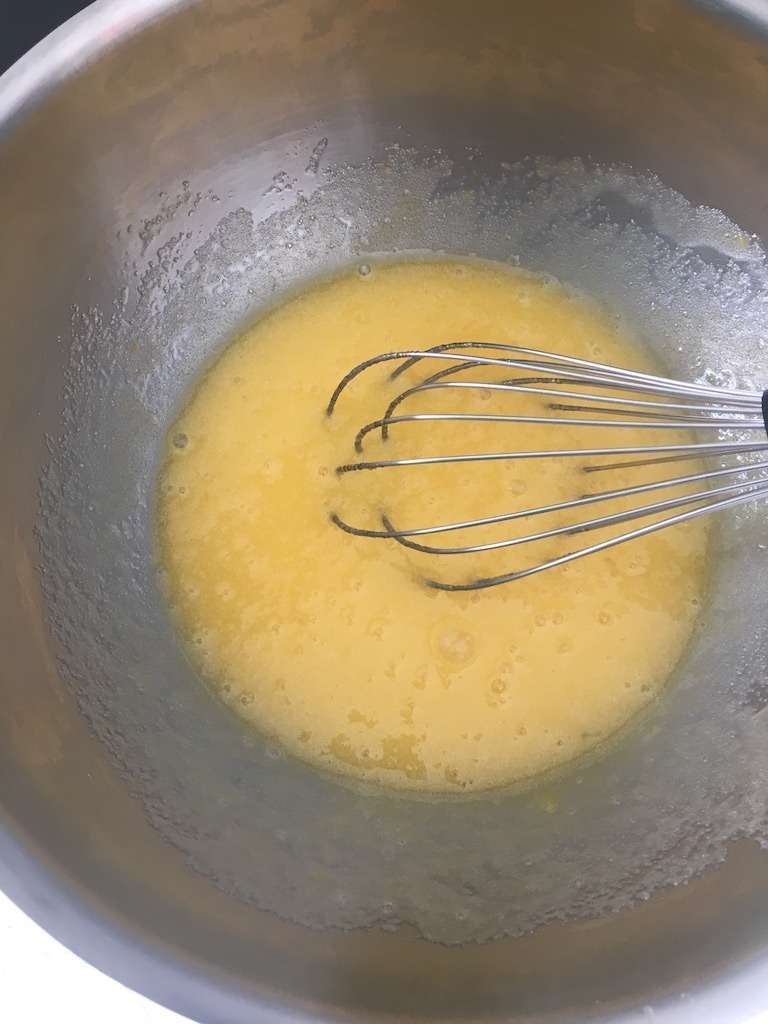 - Dans un grand cul de poule, fouetter les oeufs et le sucre jusqu’à l’obtention d’un mélange homogène.