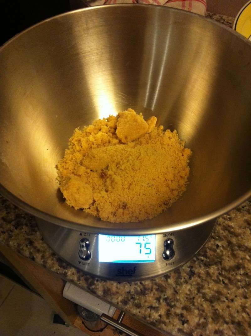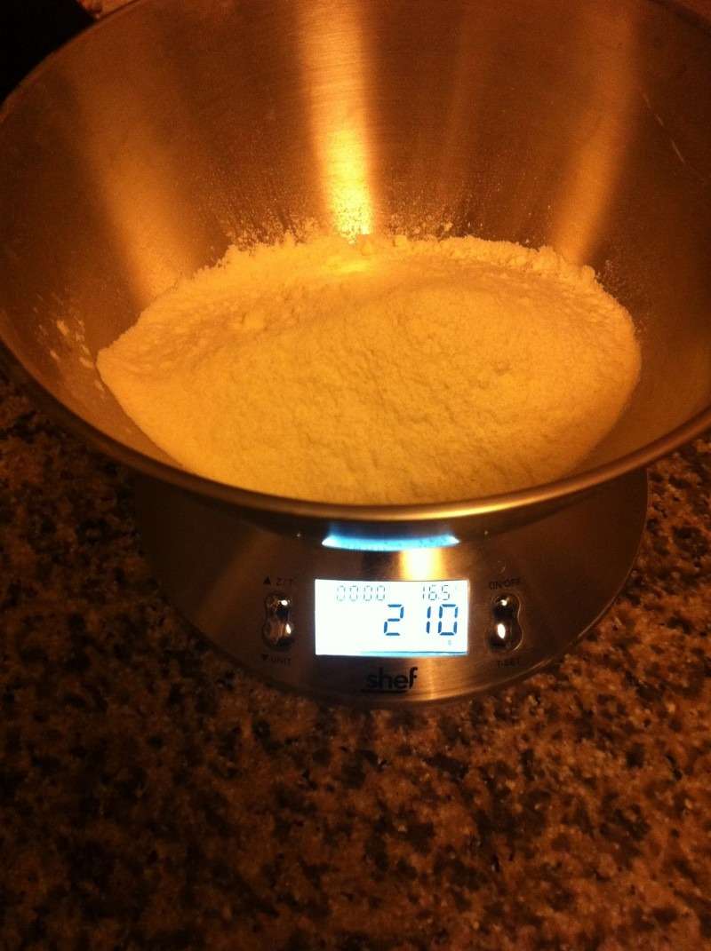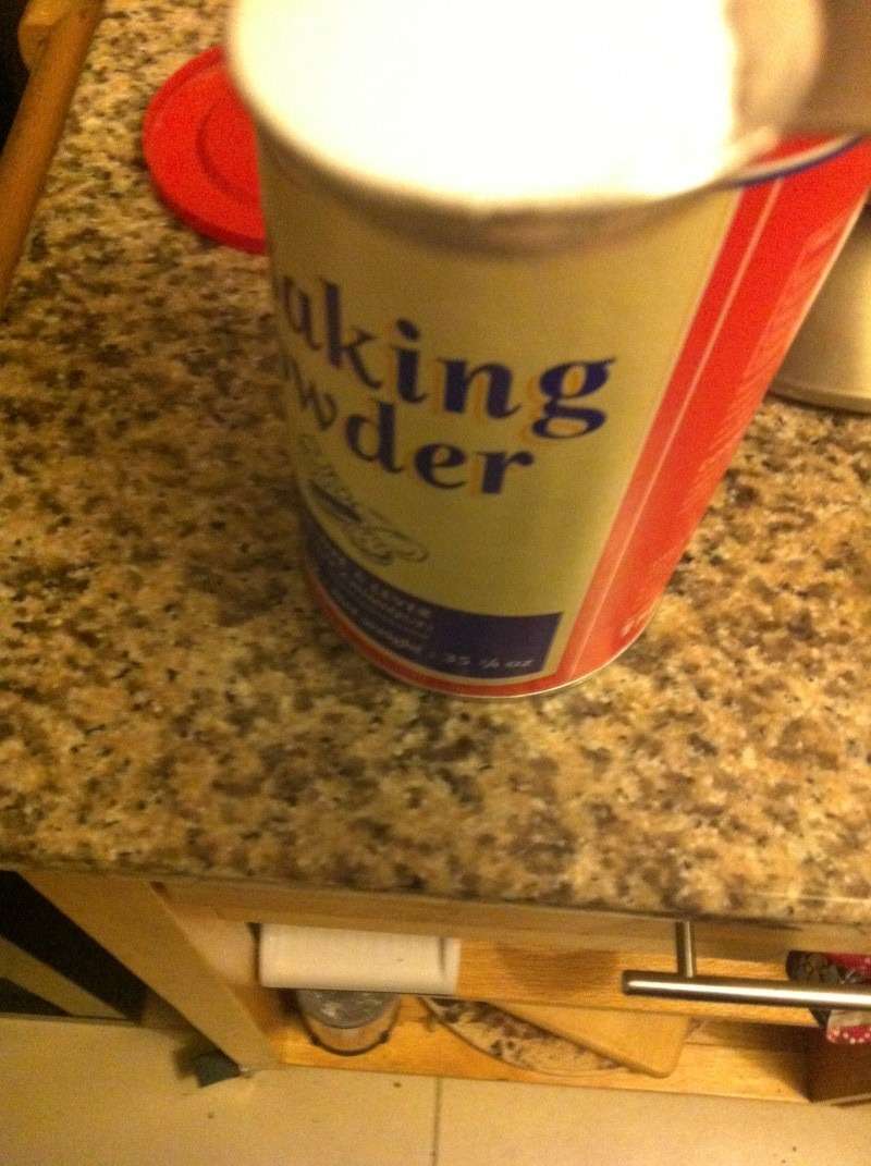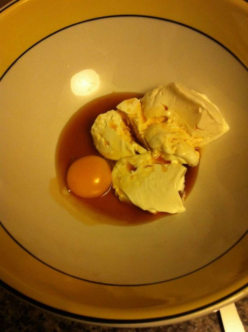 2) Préparer le mélange liquide : dans un autre saladier combiner la crème fraiche, l’oeuf, la vanille et le beurre fondu.