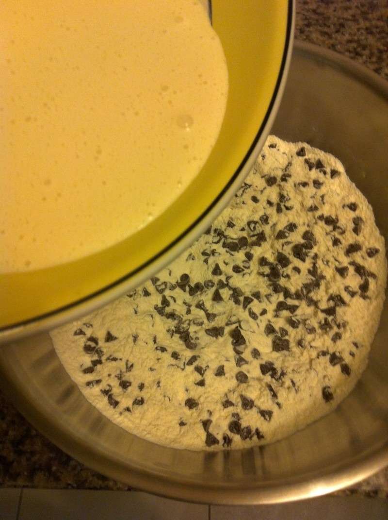 1) Préparer le mélange sec : ajouter la farine, la baking powder, le baking soda, le sel, le sucre, la cassonade et les pépites de chocolat. Réserver.