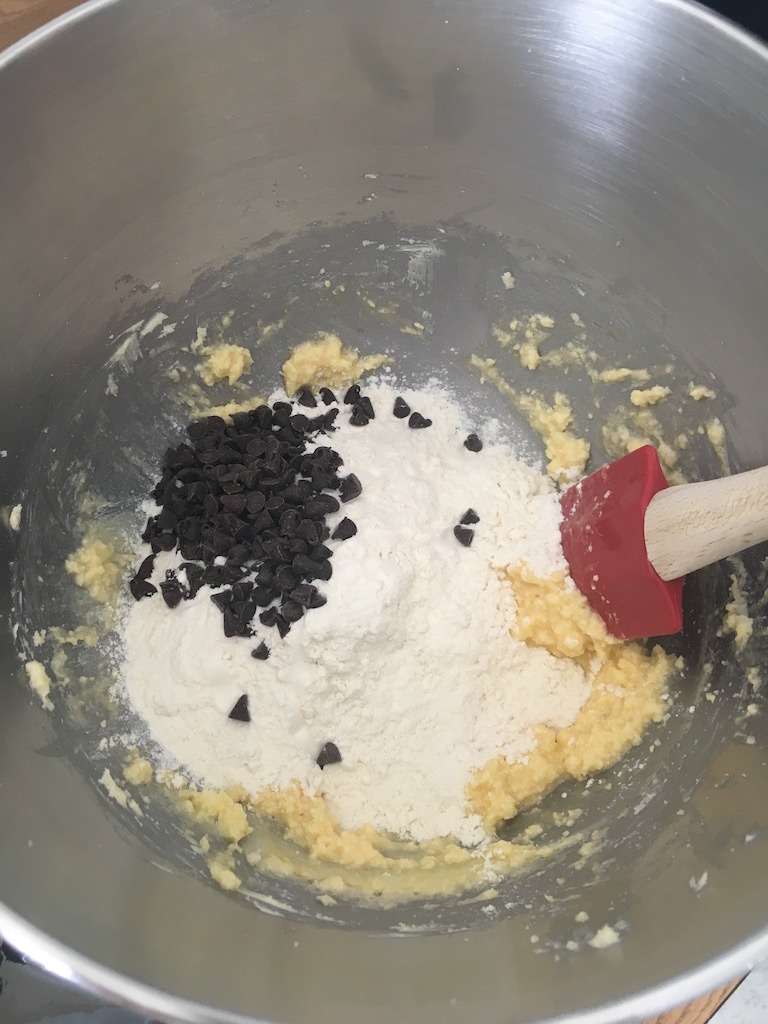 - Terminer en ajoutant la farine, la levure, le sel (ou le mélange des 3) et les éclats de chocolat.