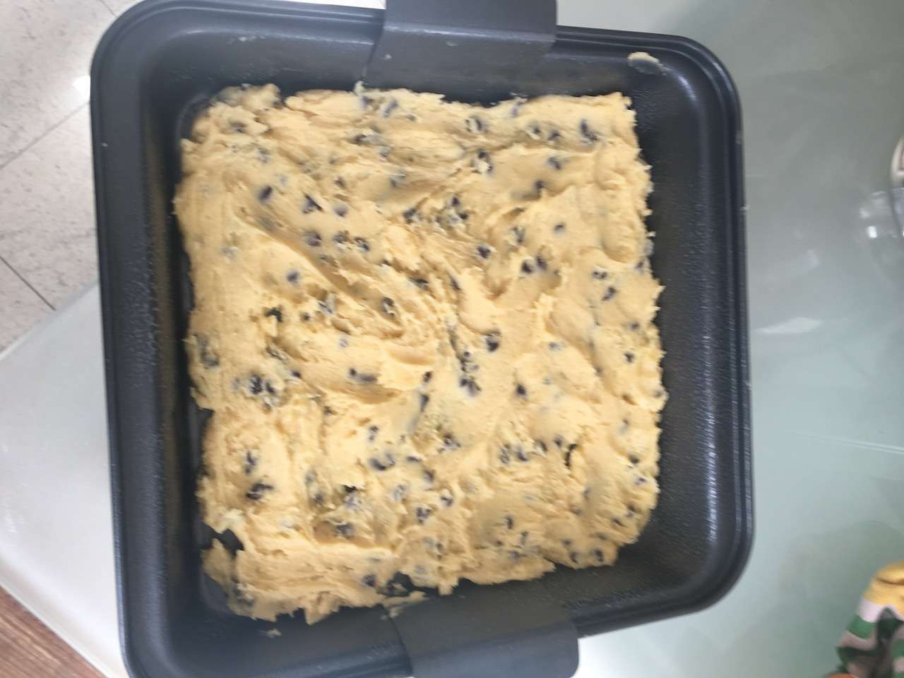 - Verser la pâte à cookie dans le moule préalablement préparé et étaler en pressant de façon uniforme.