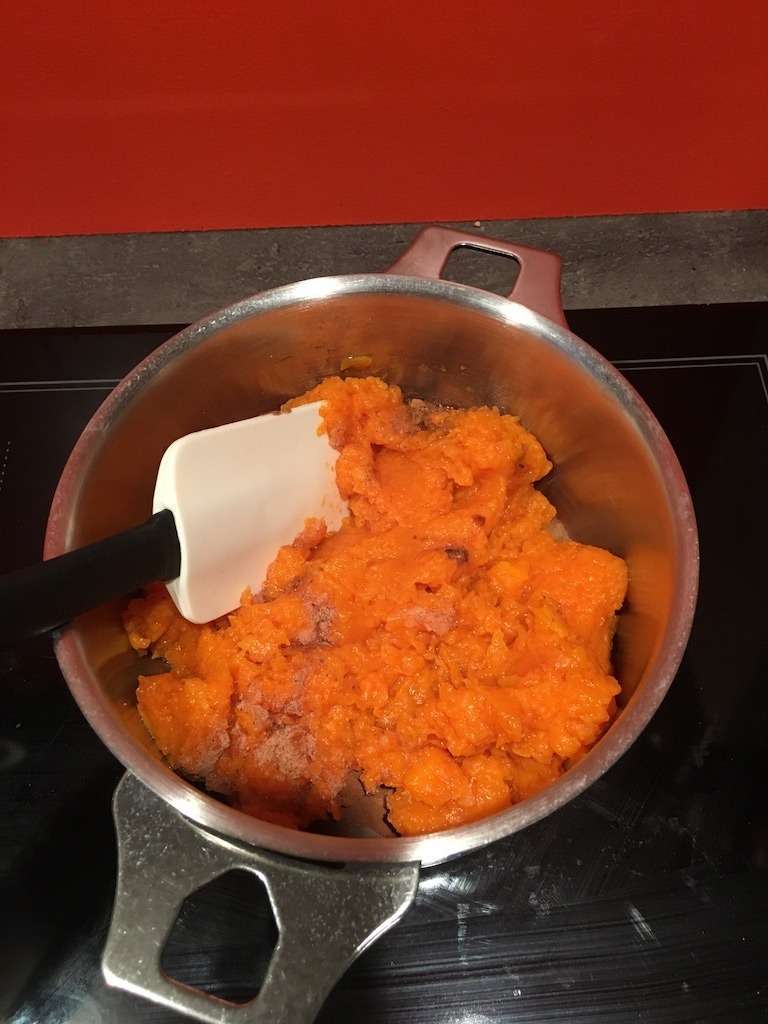Oeufs et lait mélangés - Dans une casserole de taille moyenne, verser la purée de citrouille (environ 400g). Ajouter les différentes épices : cannelle, muscade et clou de girofle. Cuire à feu moyen pendant 5 à 10 minutes, jusqu’à l’obtention d’une purée assez sèche.