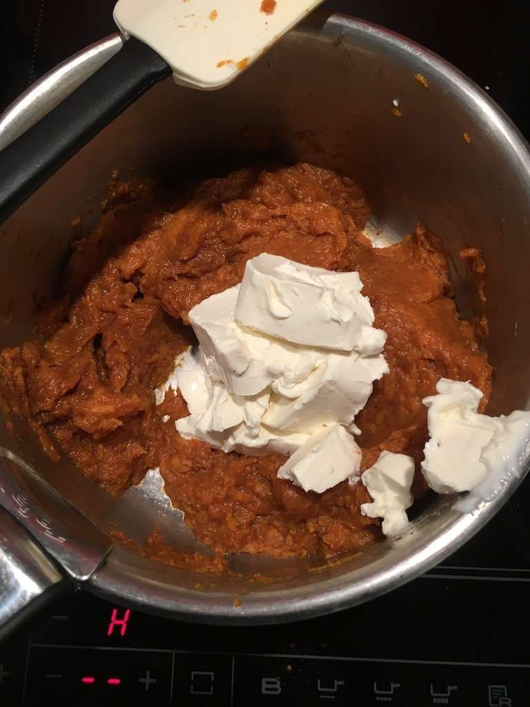 Purée de citrouille avec épices et cream cheese et le reste Le mélange - Ajouter la purée dans le mélange lait/oeufs. Mélanger au fouet.