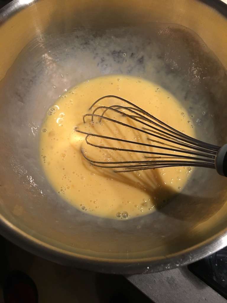 - Dans un grand cul-de-poule, casser les oeufs et ajouter le lait. Mélanger et réserver.