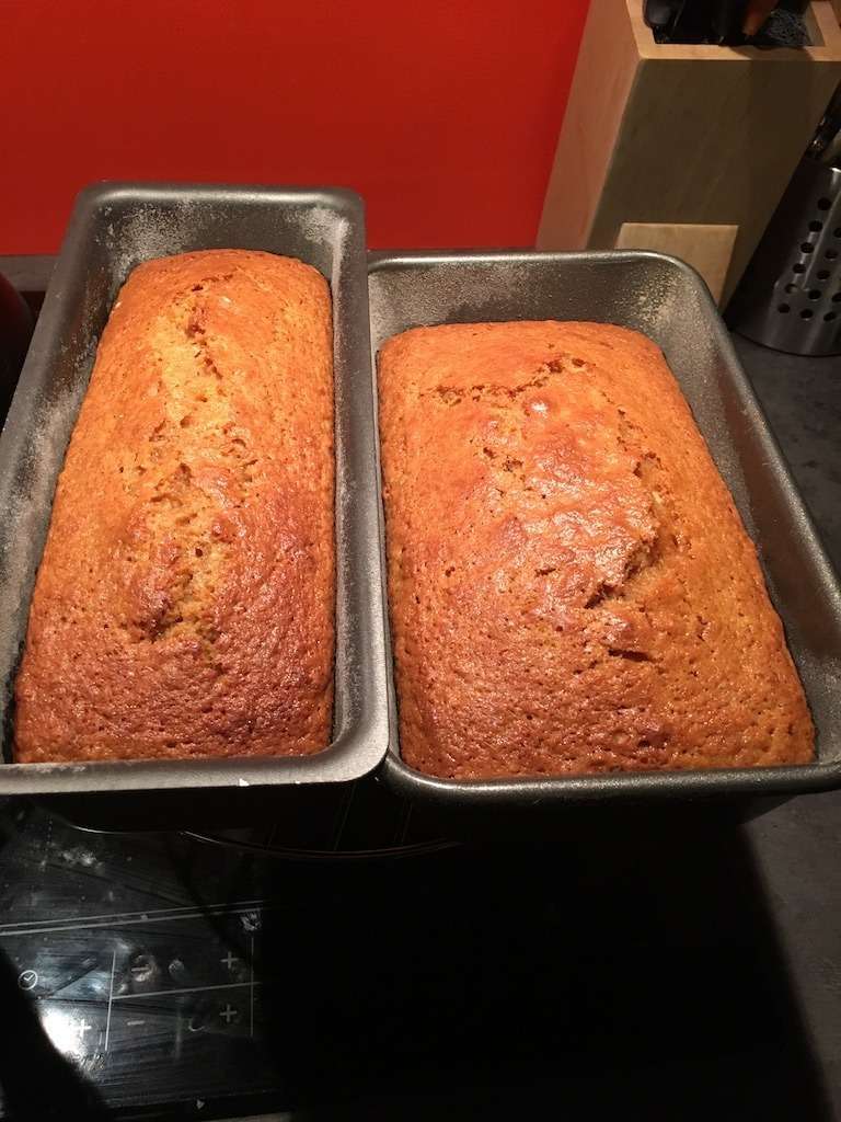 On verse le mélange avec la purée dans les oeufs+lait On mélange On ajoute la farine Voici la pâte - Verser dans 2 moules à cake préalablement beurrés et farinés.