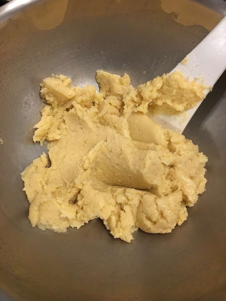 2. Ajouter le beurre pommade et mélanger jusqu’à incorporation du mélange précédent. Ne pas hésiter à utiliser ses mains si la spatule ne suffit pas.