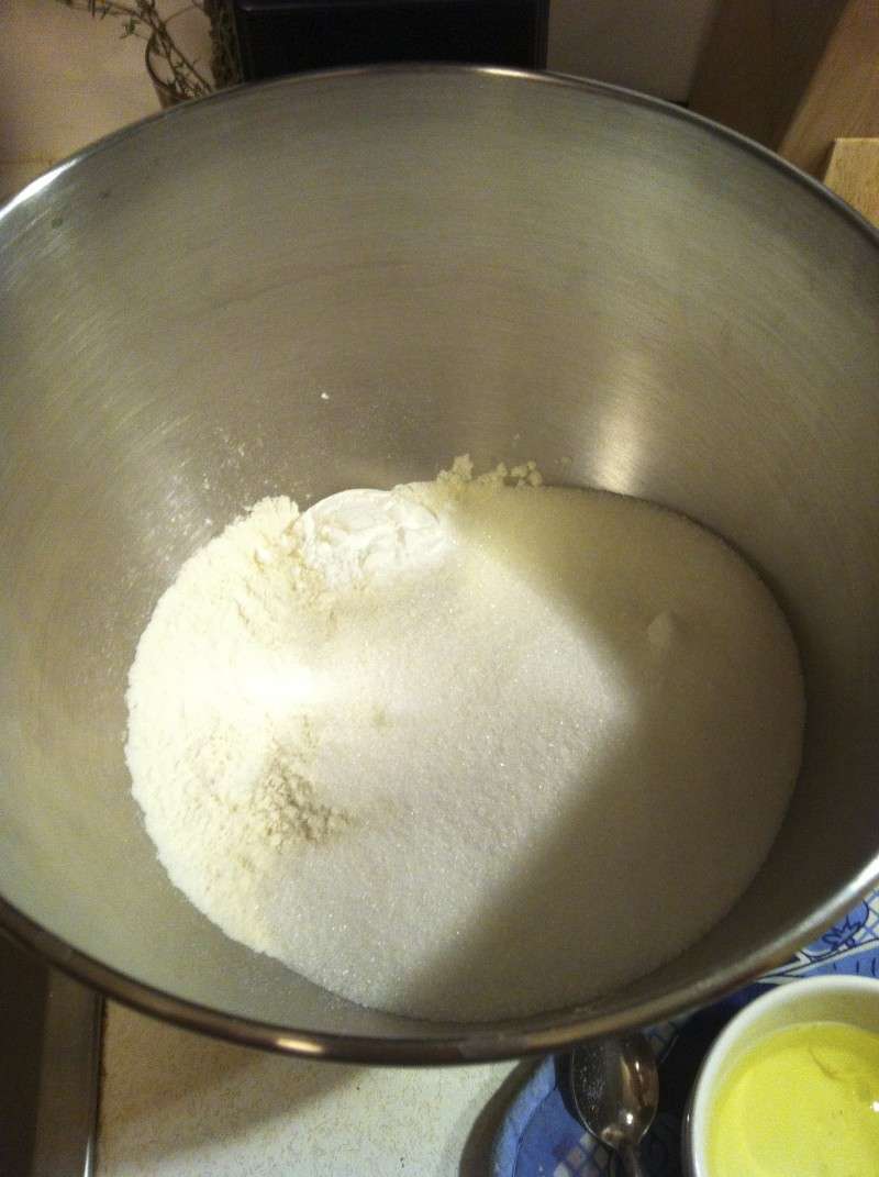 4) Dans un grand cul de poule (ou le bol de votre KitchenAid), mélanger la farine, le sucre, la levure et le sel.