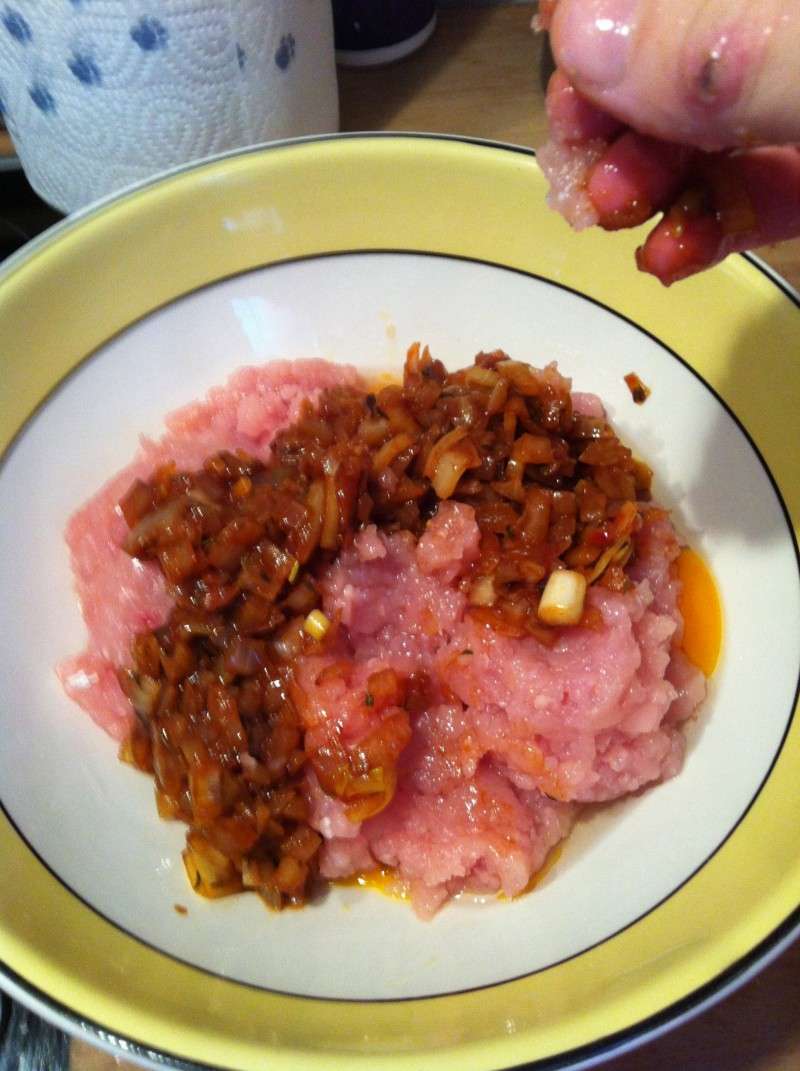 7) Ajouter le mélange avec les oignons et pétrir.