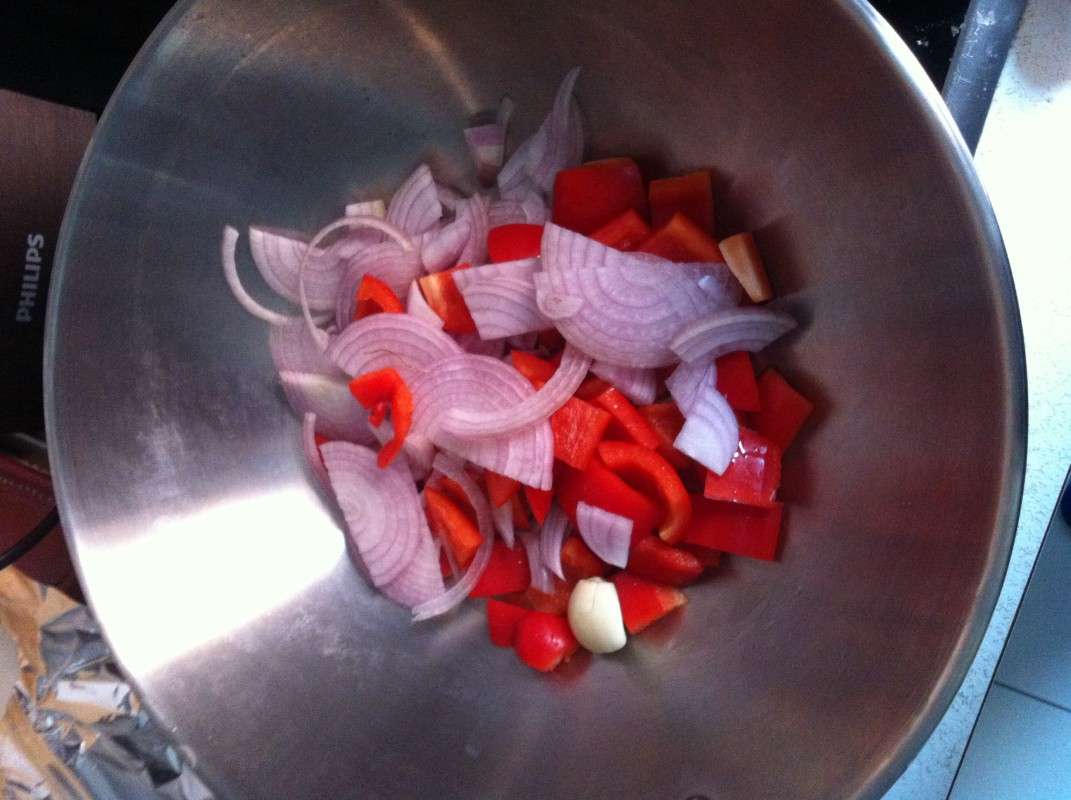 5) Lorsque l’huile est chaude, ajouter l’ail, les oignons et le poivron. Cuire pendant 5 minutes à feu moyen.