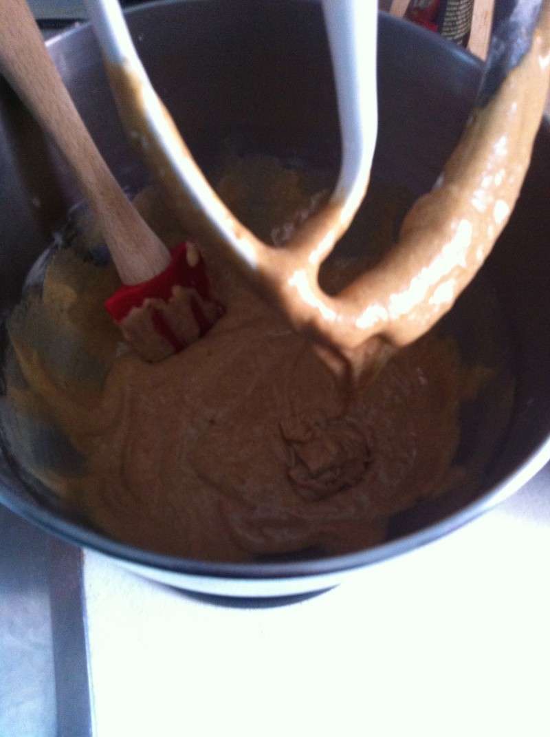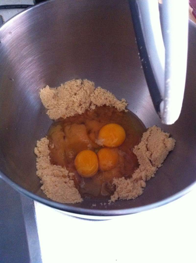 5) Mélanger dans un grand saladier la cassonade, les œufs et le jus d’orange jusqu’à l’obtention d’un mélange homogène. Vous pouvez aussi mettre tous ces ingrédients dans le bol de votre Kitchenaid Artisan équipé du batteur plat souple pour robot Artisan