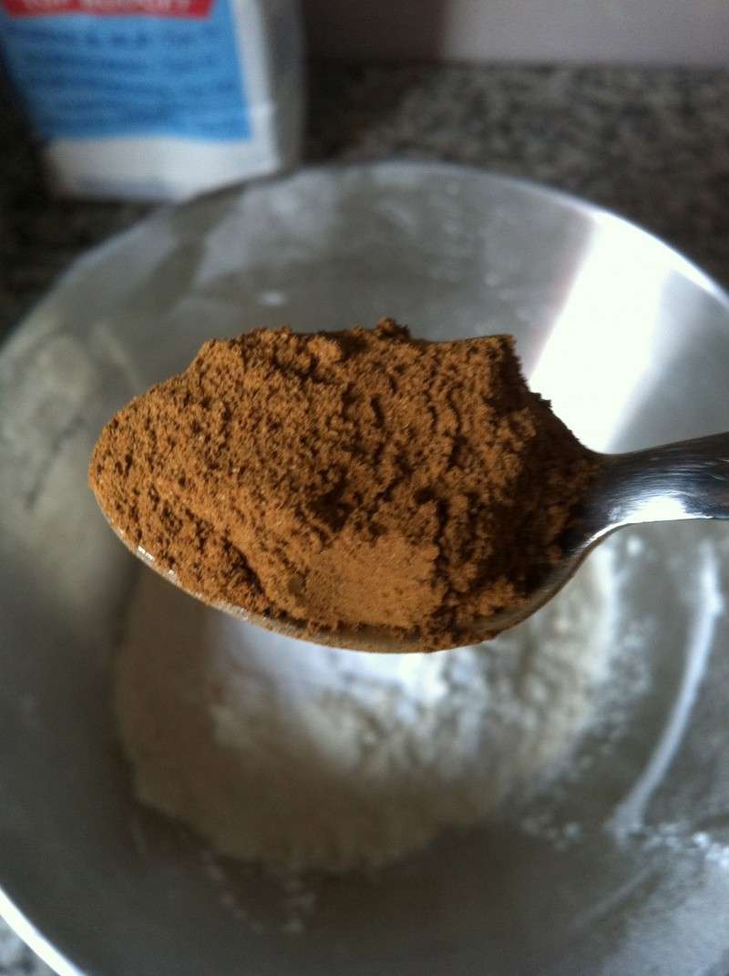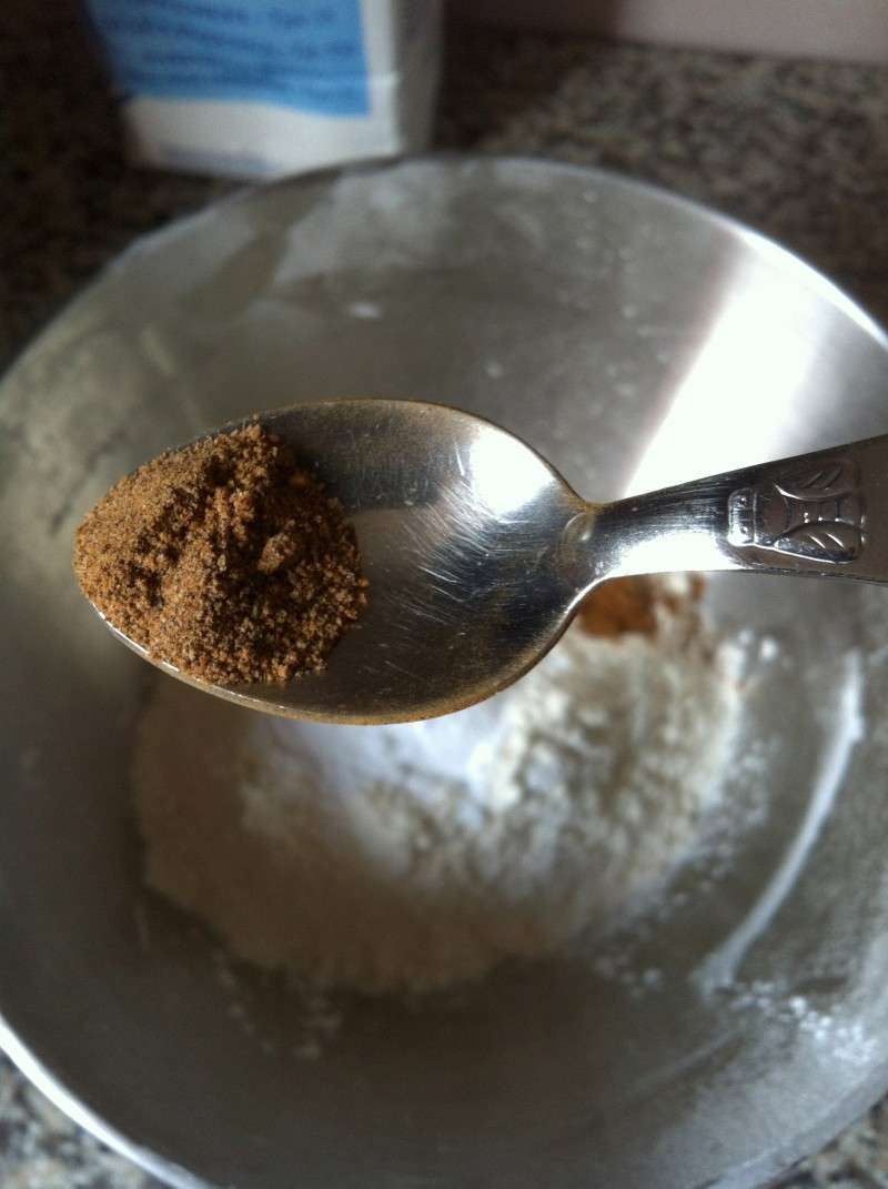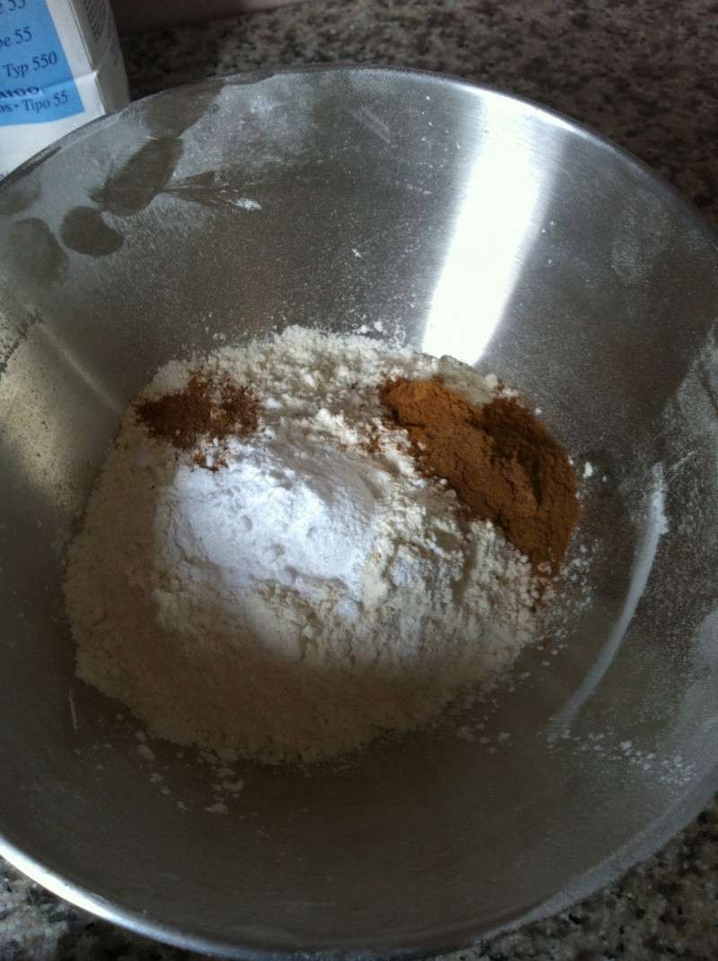 6) Dans un autre petit saladier, mélanger la farine, le sel, la levure, la cannelle et la muscade.