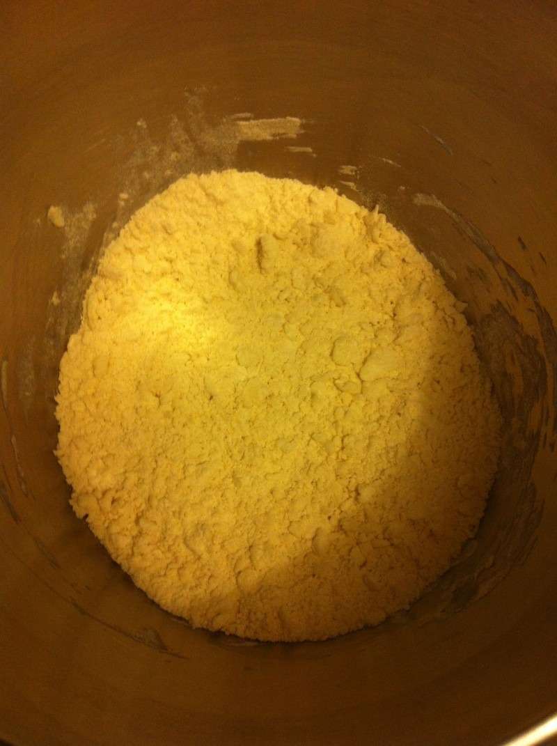3) A l’aide de la feuille de votre robot (ou vos mains), mélanger afin d’obtenir une pâte type crumble. La graisse sera en morceaux de la taille d’un petit pois ou plus petit encore.