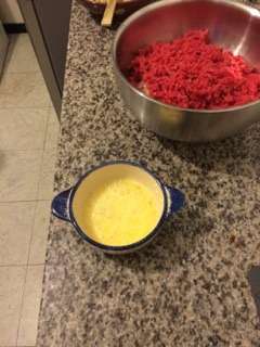 4) Verser la mixture sur la chapelure et mélanger pour faire une pâte épaisse puis laisser refroidir. 5) Une fois refroidie, ajouter le bœuf et la volaille (ou le porc), ainsi que les œufs. Malaxer le tout à l’aide de vos mains.